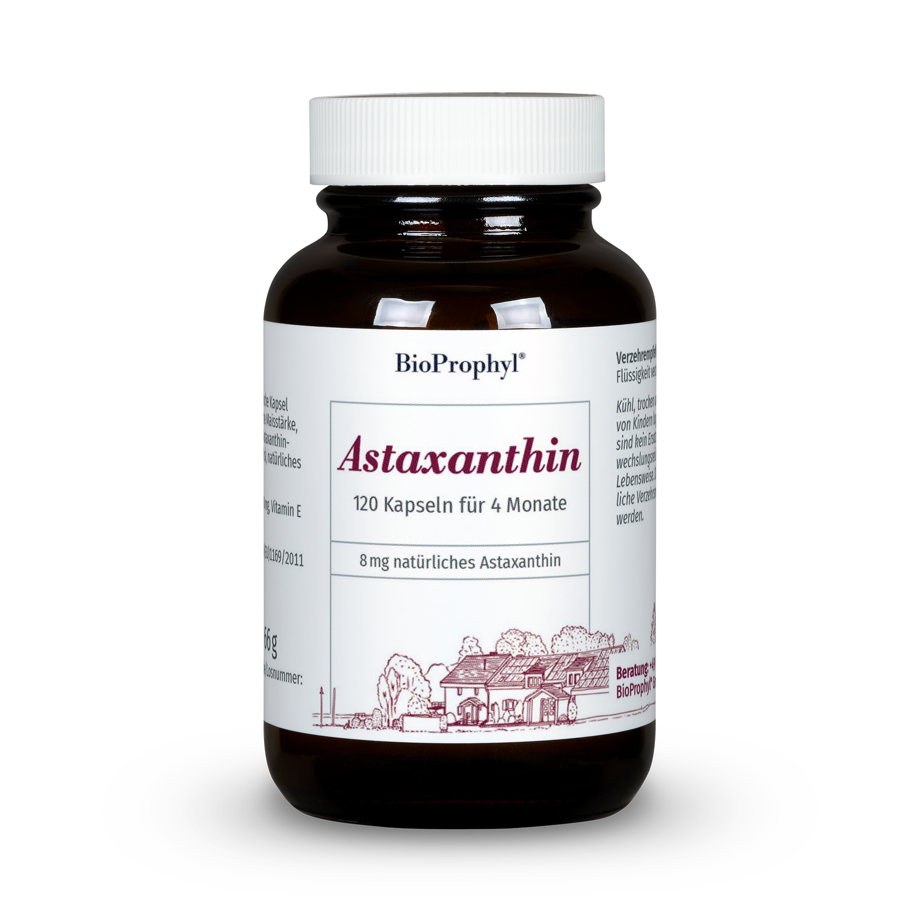 Astaxanthin: 8 mg Astaxanthin aus Haematococcus pluvialis Astaxanthin enthält 8 mg natürliches Astaxanthin als Extrakt aus der Grünalge Haematococcus pluvialis gelöst in nativem Olivenöl und ergänzt mit natürlichem Vitamin E zum Schutz der Zellen vor oxidativem Stress. Die Kapseln sind zu 100 % pflanzlich und damit auch ideal für Vegetarier und Veganer. Astaxanthin – Eine Alge im Stresstest Astaxanthin gehört zu den sekundären Pflanzenstoffen und zählt als Farbstoff zur Gruppe der Carotinoide. Natürlicherweise wird es von der Mikroalge Haematococcus pluvialis gebildet. Diese setzt Astaxanthin in Stresssituationen frei, wie zum Beispiel bei längeren Dürreperioden, starker Kälte oder Nahrungsknappheit. Um ihr Überleben sicherzustellen, drosselt sie ihre Stoffwechselaktivität auf ein Minimum. Sobald sich die Umweltbedingungen wieder gebessert haben, erwacht die kleine Grünalge aus ihrem Schlaf und ihr Stoffwechsel nimmt seine gewohnten Tätigkeiten wieder auf. Astaxanthin verleiht ihr also eine enorme Widerstandskraft gegen extreme Einflüsse aus der Umwelt.