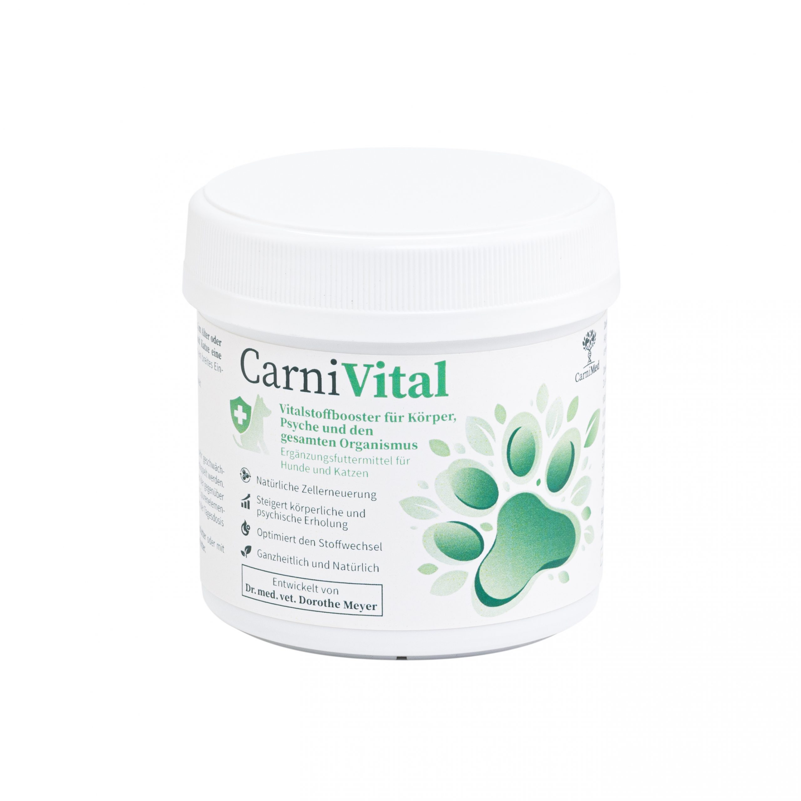 CarniVital – Vitamine für Hunde, Vitalstoffe für Körper &PsycheCarniVital Natürliche ZellerneuerungSteigert psychische Erholung und WohlbefindenOptimiert den Stoffwechselfür gesunde Haut und schönes FellCarniVital ist unsere innovative Vitalstoffkombination basierend auf hoch konzentrierten Nukleotiden, Spirulina, dem Hefekomplex Yang,Hafergras, Mineralstoffen und Vitaminen. Mit dieser außergewöhnlichen Zusammensetzung bietet dieses innovative Produkt ein weites Einsatzspektrum:Erhöht die Stressresistenz und das psychische Wohlbefinden von Ihrem Hund!Entlastung von Leber und NierenBessere Verträglichkeit von Operationen, Impfungen und MedikamentenBindung pathogener (krankmachender) Keime im Darm Stärkung des ImmunsystemVerkürzte Regenerationsvorgänge Zum Erhalt und Aufbau gesunder ZellenSchutz vor ÜbersäuerungGeruchsneutralisierende Wi…