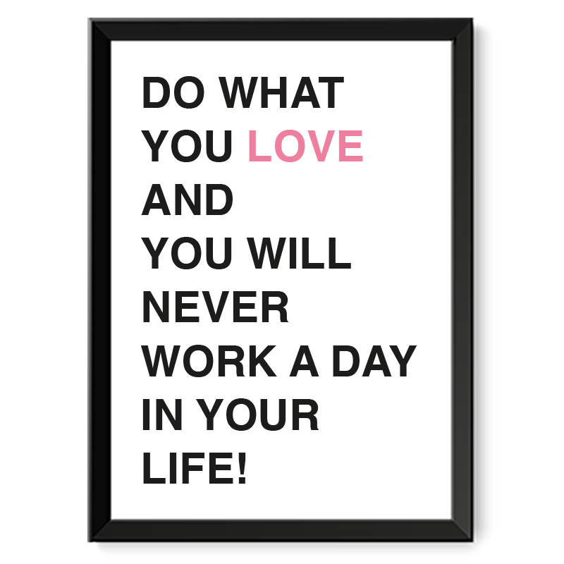 DO WHAT YOU LOVE AND YOU WILL NEVER WORDK A DAY IN YOUR LIFE BILD IM HOLZ-RAHMEN A4 GESCHENKE GESCHENKIDEEN ZUR MOTIVATION ZUM GEBURTSTAG WEIHNACHTENSichere Dir jetzt dieses persönliche Geschenk für einen lieben Menschen! Du wirst ihn/sie damit garantiert zu Freudentränen rühren. VersprochenEIN EDLER RAHMEN RUNDET DAS BILD AB: Das liebevoll gestaltete Bild in DIN A4 wird in einem edlen schwarzen Rahmen aus Pinienholz mit den Maßen 23,5 x 32,5 cm geliefert, der sowohl zum Hinstellen als auch zum Anhängen geeignet ist.EINE LEBENSLANGE FREUDE: Das Motiv wird in Galeriequalität mit kräftigen Farben auf weißem stabilen Fotokarton gedruckt und wird durch das bruchsichere und lichtundurchlässige Kunstglas vom Bilderrahmen optimal geschützt. Das Bild ist somit licht- und alterungsbeständig – so bleibt die Freude am Bild ein Leben lang erhalten.SCHÖNE GESCHENKIDEE: Das liebevoll gestaltete Produkt mit der Extraportion Motivation ist eine schöne Geschenkidee für das Büro, den Arbeitsplatz oder zum Schul- oder Studiumanfang. Überrasche einen lieben Menschen mit einem persönlichen Geschenk, das von Herzen kommt.100% ZUFRIEDENHEIT: Das Produkt wird mit viel Liebe in unserer Manufaktur in Deutschland in Handarbeit hergestellt. Die Qualität unserer Produkte liegt uns dabei sehr am Herzen. Solltest Du dennoch unzufrieden sein, erhältst Du Dein Geld zurück!