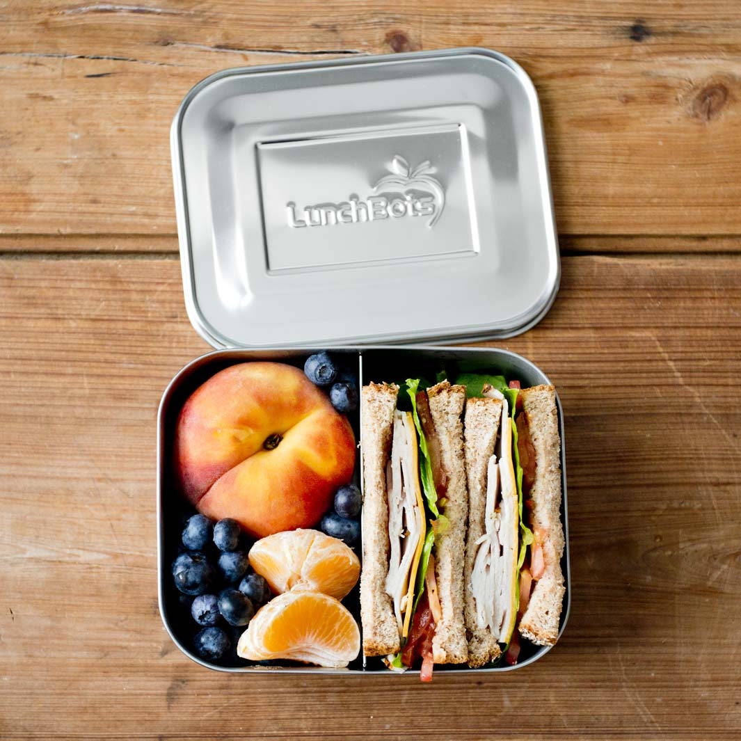 LunchBots Edelstahl Bento Box Medium – Duo Hol dir unsere 2-Fächer Bento-Box, entworfen für ein halbes Sandwich und eine große Beilage. Die beiden gleich großen Abschnitte der Lunchbox geben dir die Flexibilität, zwei gesunde Lebensmittel in einen Behälter zu packen. Pack ein halbes Roastbeef-Sandwich und Gemüse oder ein halbes Erdnussbutterbrot und Obst ein. Diese Edelstahl-Bento-Box passt mühelos zu einem herzhaften Snack. Bitte beachte: Dieses Produkt ist nicht auslaufsicher. Es wird empfohlen, nur trockene Lebensmittel zu verwenden. Eigenschaften: Material: 18/8 Edelstahl in Lebensmittelqualität Spülmaschinenfest Kapazität: ca. 590ml Gewicht: ca. 260g Maße: ca. 15,2 x 12,7 x 4,5cm Jeder Abschnitt: ca. 7,6 x 12,7cm Schadstofffrei BPA-Frei Extrem lange Lebensdauer Lieferung: Lunchbox plastikfrei verpackt in recyceltem Pappkarton