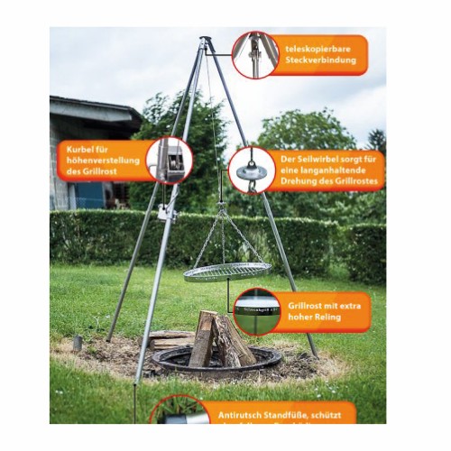 Technische Eigenschaften:- Dreibeingrill- Höhe 1,70 m- das Rundrohr Dreibein hat ein Stellmaß von 1,3m Schenkelmaß vom Dreieck.- mit Grillrost Durchmesser ab 50 cm- alles aus Edelstahl- Made in Germany (original Idar Oberstein)- Rehling mit LasergravurAuf einen Blick:- Teleskopierbare Standrohre (Einrastsystem)- Komplett aus Edelstahl- Schneller Auf- und Abbau- Einfacher Transport- Kompaktes StaumaßLieferumfang Inkusive:- Edelstahl Dreibein Schwenkgrill- Edelstahl Grillrost 50cm, 60cm Druchmesser- Edelstahl Kurbel für flexible Höhenverstellung- Edelstahl Grillrost Aufhängung- Edelstahl Seilwirbel für gleichmäßiges Schwenken
