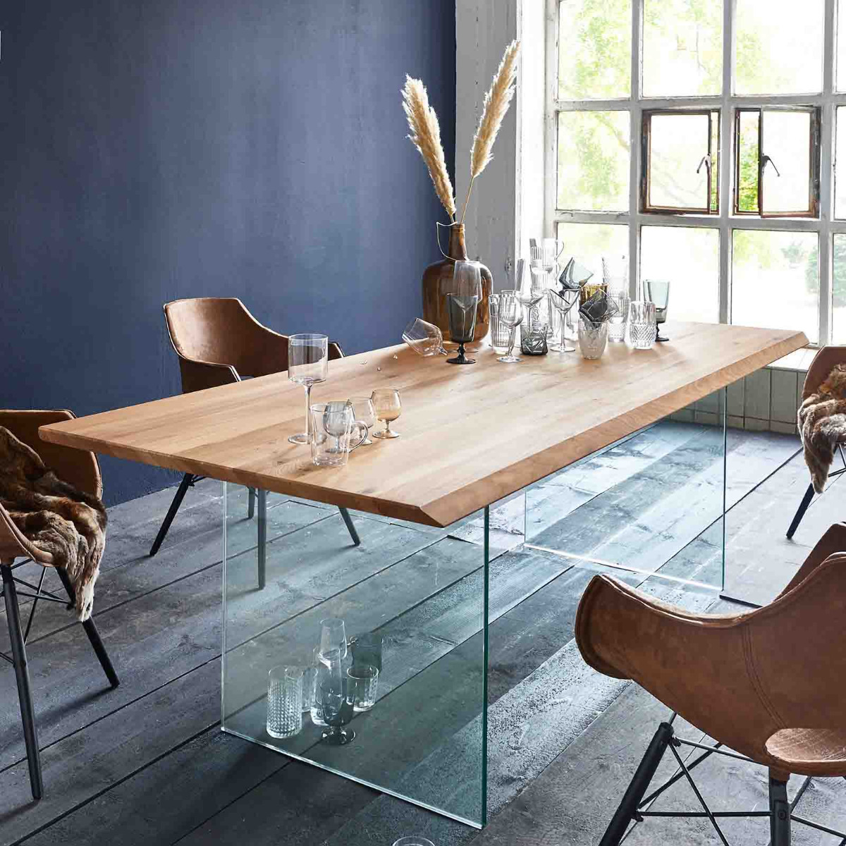 Esstisch Miles aus massiver Wildeiche mit Glasgestell | massive-naturmoebel