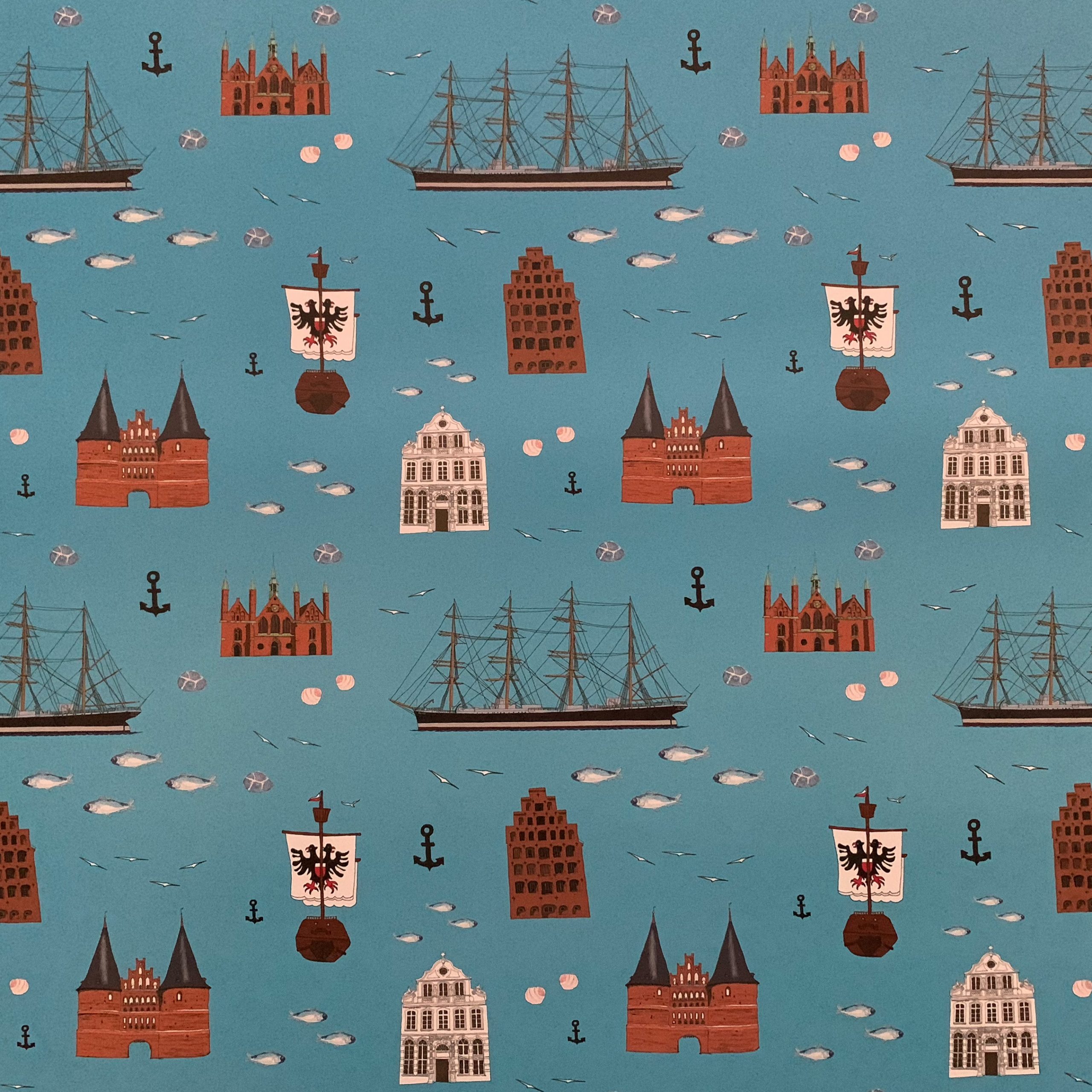 Ein Bogen Geschenkpapier mit Lübeck Motiven bedruckt.