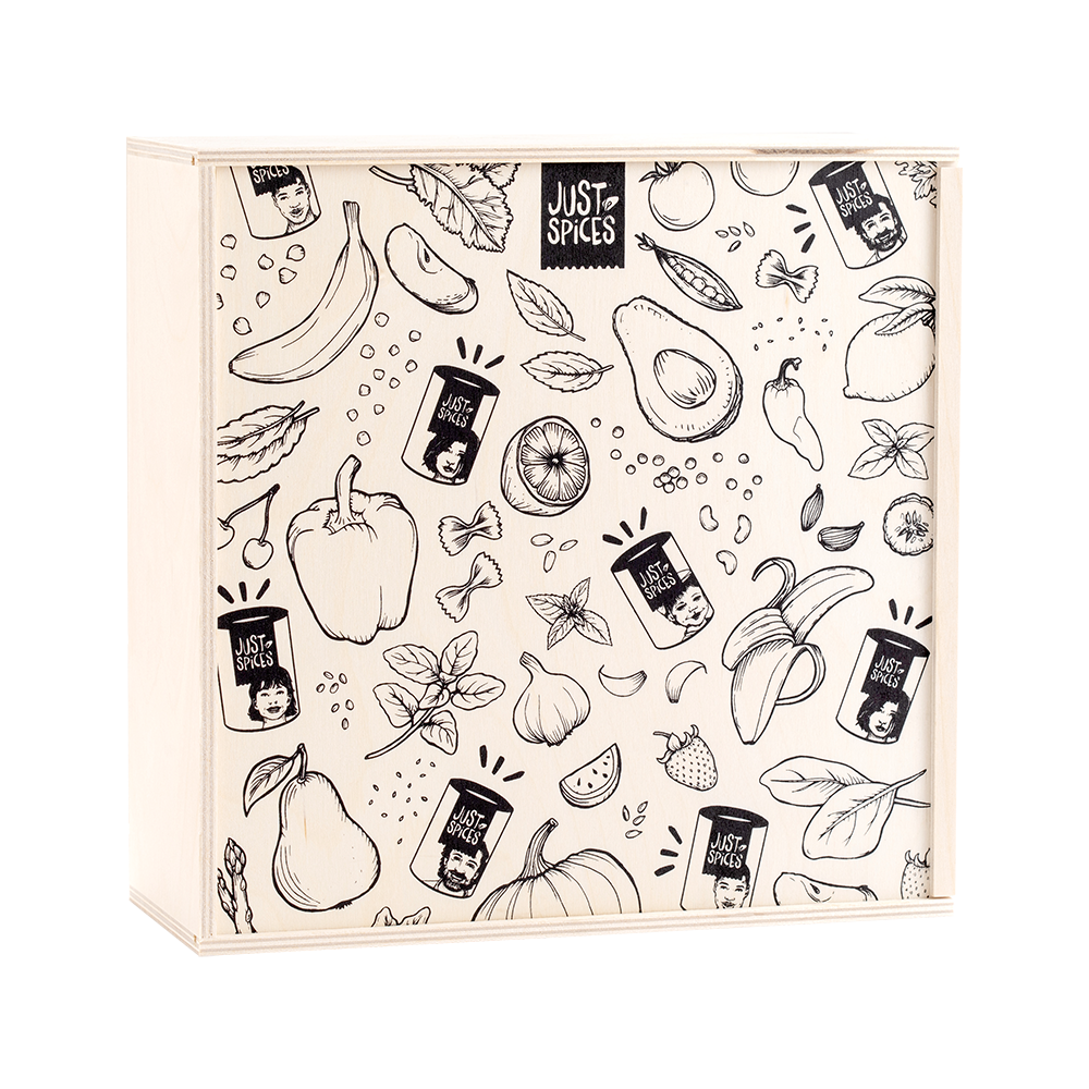 Damit hast Du 16 Gewürzmixe immer griffbereit: Die langlebige Holzbox ist praktisch für zu Hause oder unterwegs – und sieht cool aus. Du willst die Box verschenken? Easy, wähle dazu passende Mixe und verschenke diese nachhaltig in der Holzbox.