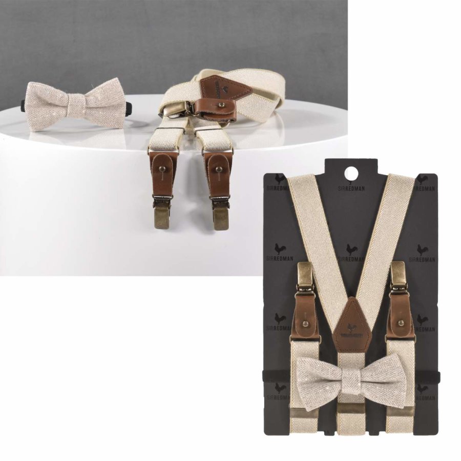 Farbe: taupe – Combi-Pack für Jungen Kinderhosenträger mit Fliege – von Hand gefertigt – in Y-Form – 3 Gurte 25mm, verstellbar – mit Clips zur einfachen Befestigung am Hosenbund