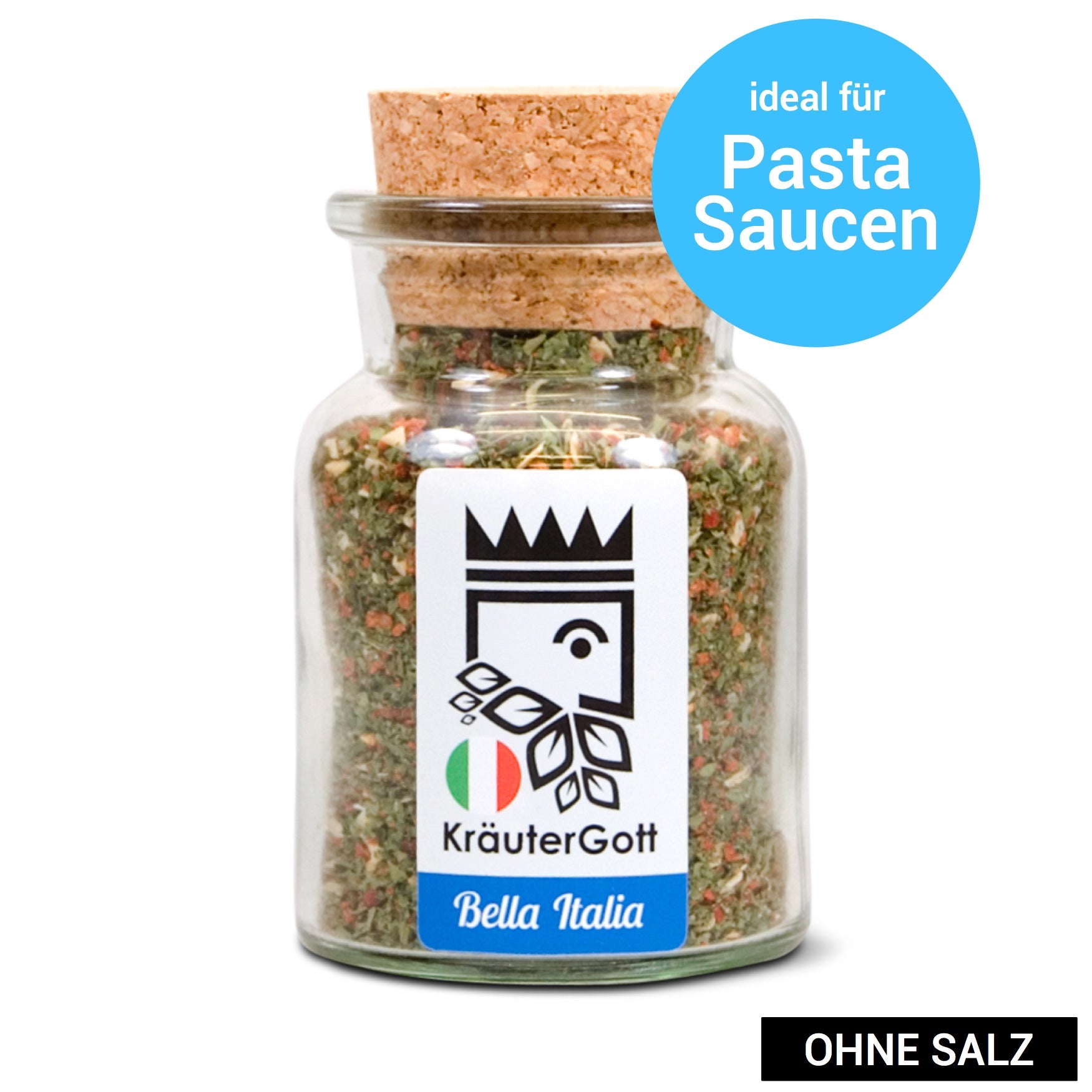 Bella Italia – Die ideale Grundlage für eine perfekte italienische Pasta Sauce Wer kennt es nicht? Du willst schnell eine leckere Pastasauce kochen und am Ende schmeckt sie langweilig und fad. Dieses Problem gehört ab sofort der Vergangenheit an!Unsere Kräutermischung “Bella Italia” bringt die volle Ladung Italien direkt in deinen Kochtopf. Dank einer perfekten Komposition von typisch italienischen Kräutern und einer ordentlichen Portion Knoblauch, Paprika und Chili, wird deine nächste Pastasauce garantiert eine würzig-scharfe Geschmacksexplosion. Bella Italia – Entworfen von einem echten Italiener!”Bella Italia” haben wir zusammen mit unserem Freund Lorenzo kreiert. Lorenzo stammt aus der Region Abruzzo in Italien und hat den intensiven Geschmack schon von Geburt an im Blut. Heute ist Lorenzo viel in der Welt unterwegs und hat dank “Bella Italia” immer eine Portion Heimat im Gepäck. Inhaltsstoffe: Getrockneter Knoblauch, Petersilie, Paprikaflocken, Chiliflocken und KerbelKräuterGott Kräuterwissen: Kerbel ist mit der Petersilie verwandt und sieht ihr auch optisch sehr ähnlich. Von den Engländern wird Kerbel Franzosenpetersilie genannt. Geschmacklich kommt Kerbel vor allem in cremigen Soßen zu Geltung. Wahrscheinlich auch deswegen wird er in Italien gerne für Pasta Saucen verwendet. Kerbel stärkt das Immunsystem und soll bei Kopfschmerzen helfen, quasi ein Natur Aspirin.Unser Versprechen: 100% natürlich, ohne ZusatzstoffeNettofüllmenge: 50g im GlasVon Hand abgefüllt in einem Glas mit Korkverschluss, ideal zum Wiederbefüllen