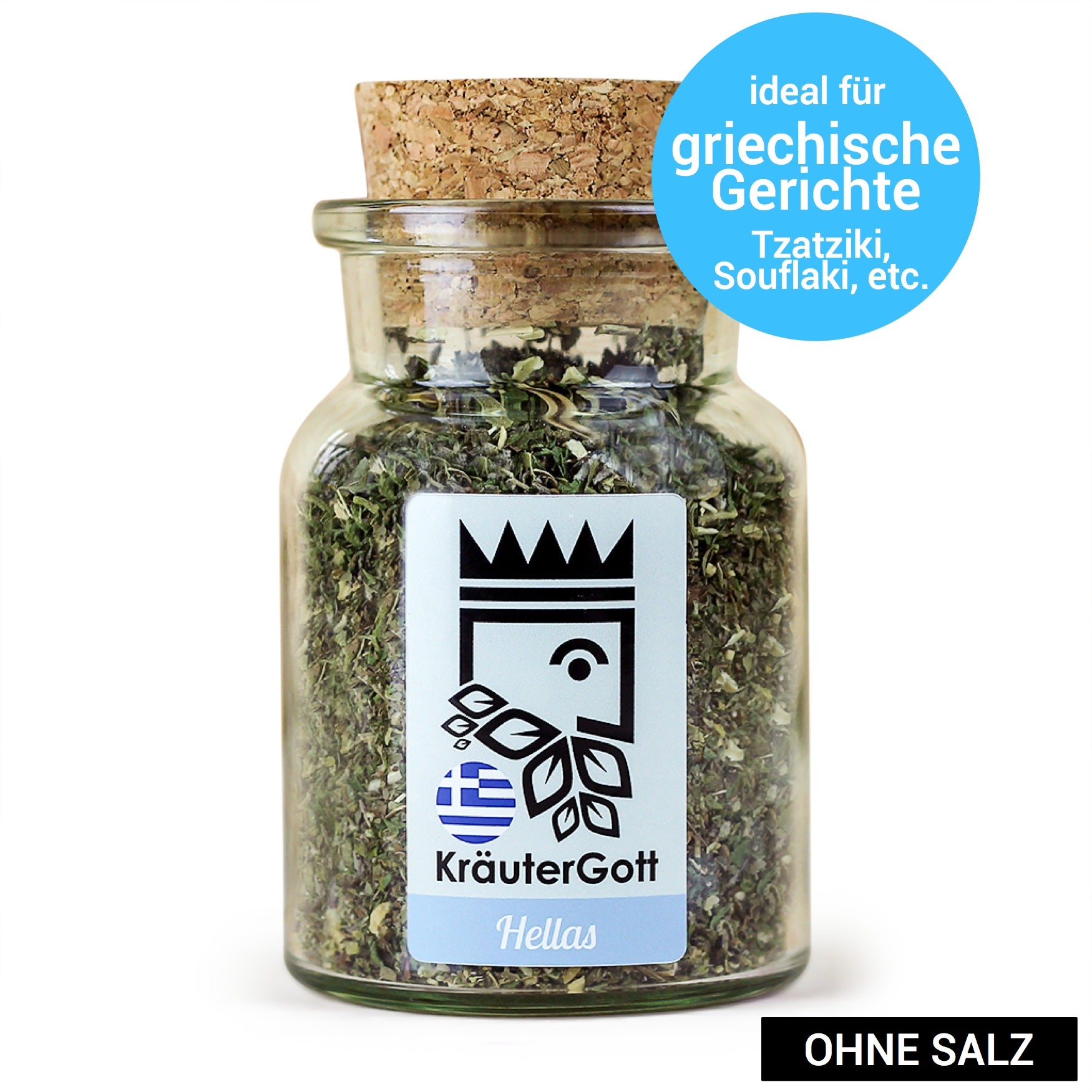 Hellas – der würzig-frische Geschmack GriechenlandsDer ganze Geschmack Griechenlands in einer Kräutermischung! Durch die einzigartige Kombination von herzhaften Knoblauch- und Zwiebelstücken mit herrlich-frischen Kräutern wie Melisse und Minze ist Hellas die perfekte Kräutermischung für griechische Fleisch- & Reisgerichten und zum Verfeinern von Tzatziki. Hellas – mit echter Erfahrung kreiertWir waren schon oft in Griechenland und haben uns jedes Mal aufs neue in die griechische Küche verliebt. Bei der Kreation unserer griechischen Kräutermischung haben wir aber dennoch einen echten Experten zu Rate gezogen: Mit den Tipps des waschechten Griechen Angelos aus Patras haben wir eine würzig-frische Mischung kreiert, die sofort Urlaubsgefühle weckt.Inhaltsstoffe: Knoblauch, Minze, Melisse, Salbei, Petersilie, Zwiebeln, BohnenkrautKräuterGott Kräuterwissen: Minze, genauer gesagt die Krauseminze ist eine von 30 verschiedenen Minzesorten. Im Vergleich zur bekannteren Pfefferminze ist die Krauseminze frei von Menthol, wodurch sie besser verträglich ist. Ihr wird u.a. eine verdauungsfördernde Wirkung nachgesagt. Also: Hin und wieder mit Minze kochen lohnt sich!Unser Versprechen: 100% natürlich, ohne ZusatzstoffeNettofüllmenge: 50g im GlasVon Hand abgefüllt in einem Glas mit Korkverschluss, ideal zum Wiederbefüllen