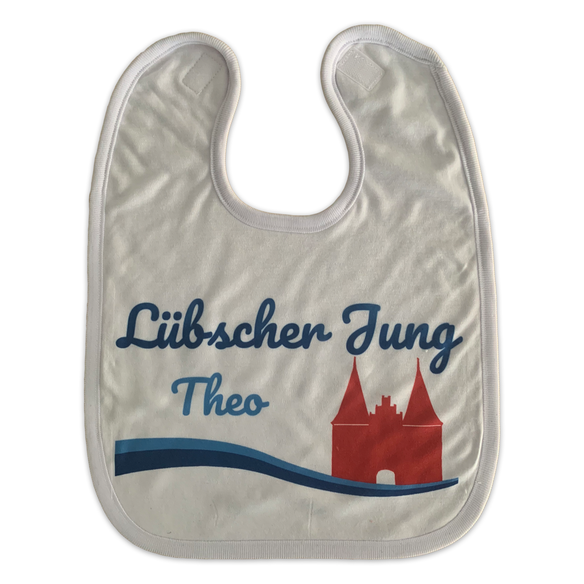 Lätzchen mit unserem Motiv “Lübscher Jung” und individuellem Namen aufgedruckt.