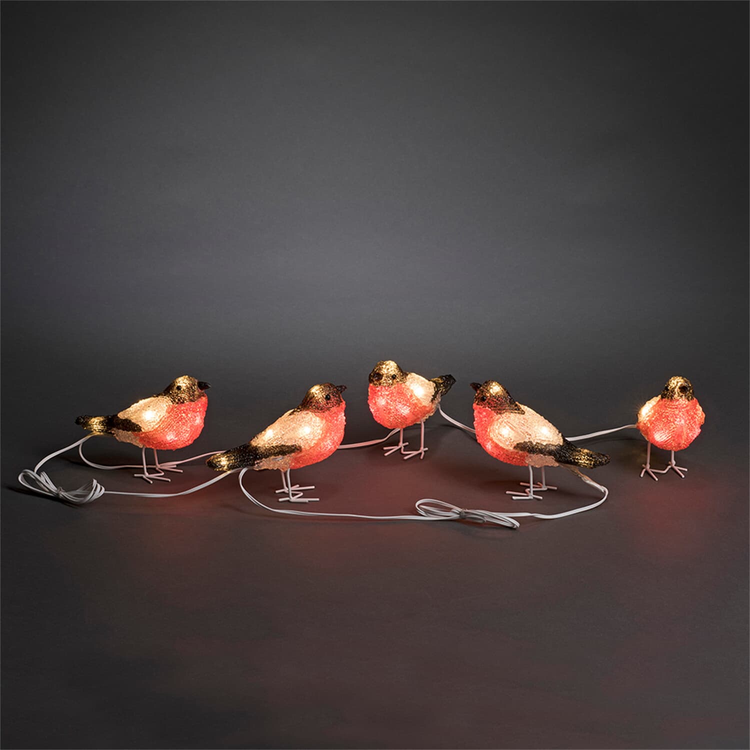 Dieses Rotkehlchen-Quintett ist der Blickfang für Ihren Garten Lassen Sie Ihrer Kreativität freien Lauf: ob auf dem Boden, auf der Terrasse, auf der Fensterbank oder im Balkonkasten – die niedlichen Vögelchen mit den runden Kugelbäuchlein verfehlen ihre Wirkung nicht Die Aufwändig gearbeiteten Vögel sind mit einem Kabel miteinander verbunden Der Abstand zwischen den Vögeln beträgt jeweils einen Meter Dadurch lassen sich die Rotkehlchen sehr vielseitig und flexibel dekorieren Set aus 5 Vögelchen Beleuchtung durch 40 kalt weiße LED Dioden 24 V Außentrafo Kabelfarbe: weiß Kabellänge: 500 cm Höhe: 12 cm für den Außenbereich geeignet