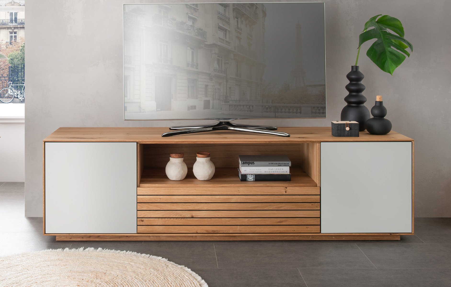 Lowboard Riva in Wildeiche geölt mit eleganter Holz-Weißglas-Kombination | massive-naturmoebel
