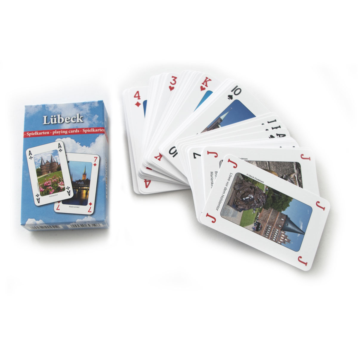 Spielkartenset bestehend aus 55 Karten mit Lübeck Motiven aufgedruckt.