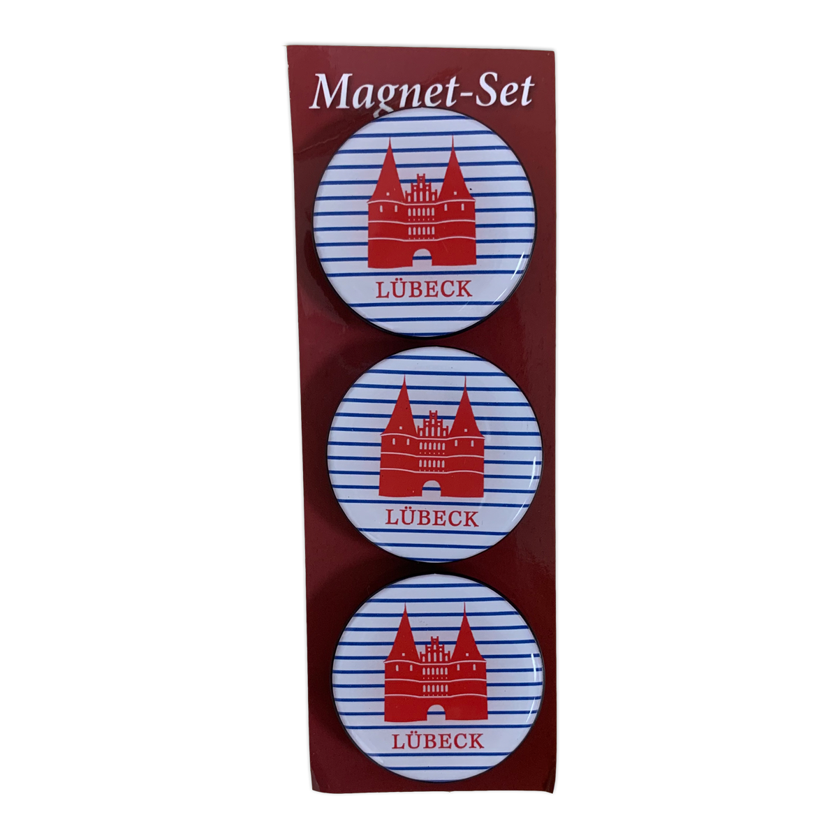 3er-Set runde Magnete mit gestreiftem Hintergrund und Holstentor in Rot aufgedruckt.