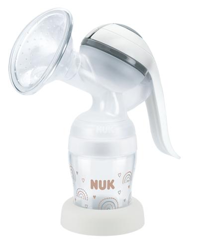 NUK Handmilchpumpe, mit weichem Silikonkissen und ergonomischem Pumphebel, inkl. NUK Perfect Match Babyflasche 150 ml, 1 Stück NUK Handmilchpumpe – Entspannt Milch abpumpen Die NUK Handmilchpumpe wurde entwickelt, um das Abpumpen so mühelos, sanft und effizient wie möglich zu machen. Die Pumpe ist einfach zu bedienen und zu reinigen. Effizient Dank innovativer Technik und Design ist die Abpumpleistung der NUK Handmilchpumpe besonders hoch. Die feinen Noppen am Silikonkissen dienen zur sanften Massage und regen den Milchfluss an. Sanft Das Soft-Brustkissen mit samtweicher Oberfläche schmiegt sich an jede Brust an und sorgt für ein angenehmes Gefühl auf der Haut. Mühelos Der Pumphebel ist ergonomisch geformt und besonders leichtgängig. Individuell Über den Pumphebel lässt sich auch die Saugstärke und Saugrhythmus individuell regulieren. Sicher abstellen und verstauen Der Standfuß passend für die NUK Perfect Match Flasche sorgt für sicheres Abstellen der Pumpe. Zum Aufbewahren der Milch einfach die Dichtscheibe mit Ring auf die Flasche drehen. Praktisch Alle Einzelteile der NUK Handmilchpumpe sind spülmaschinengeeignet. Für die Reinigung lassen sie sich leicht auseinander- und wieder zusammenbauen. Dieses NUK Set entspricht der Europäischen Sicherheitsnorm EN14350. Lesen Sie sorgfältig die Warn- und Gebrauchshinweise im Inneren. Bitte Produktinformation und Artikel-/ LOT-Nr. zur späteren Verwendung aufheben. MAPA GmbH | Industriestr. 21-25 | 27404 Zeven | Germany | www.nuk.com