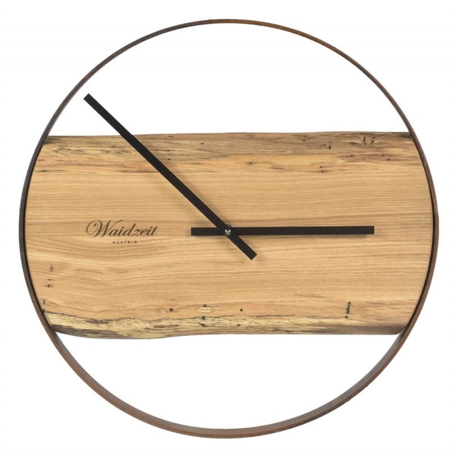 42 cm Durchmesser – heimisches Holz aus Österreich mit Baumkante – rostfarbener Rahmen aus Metall – 2 Zeigeruhr – ohne Ziffernblatt – deutsches Junghans Uhrwerk – plastikfreie Kartonverpackung
